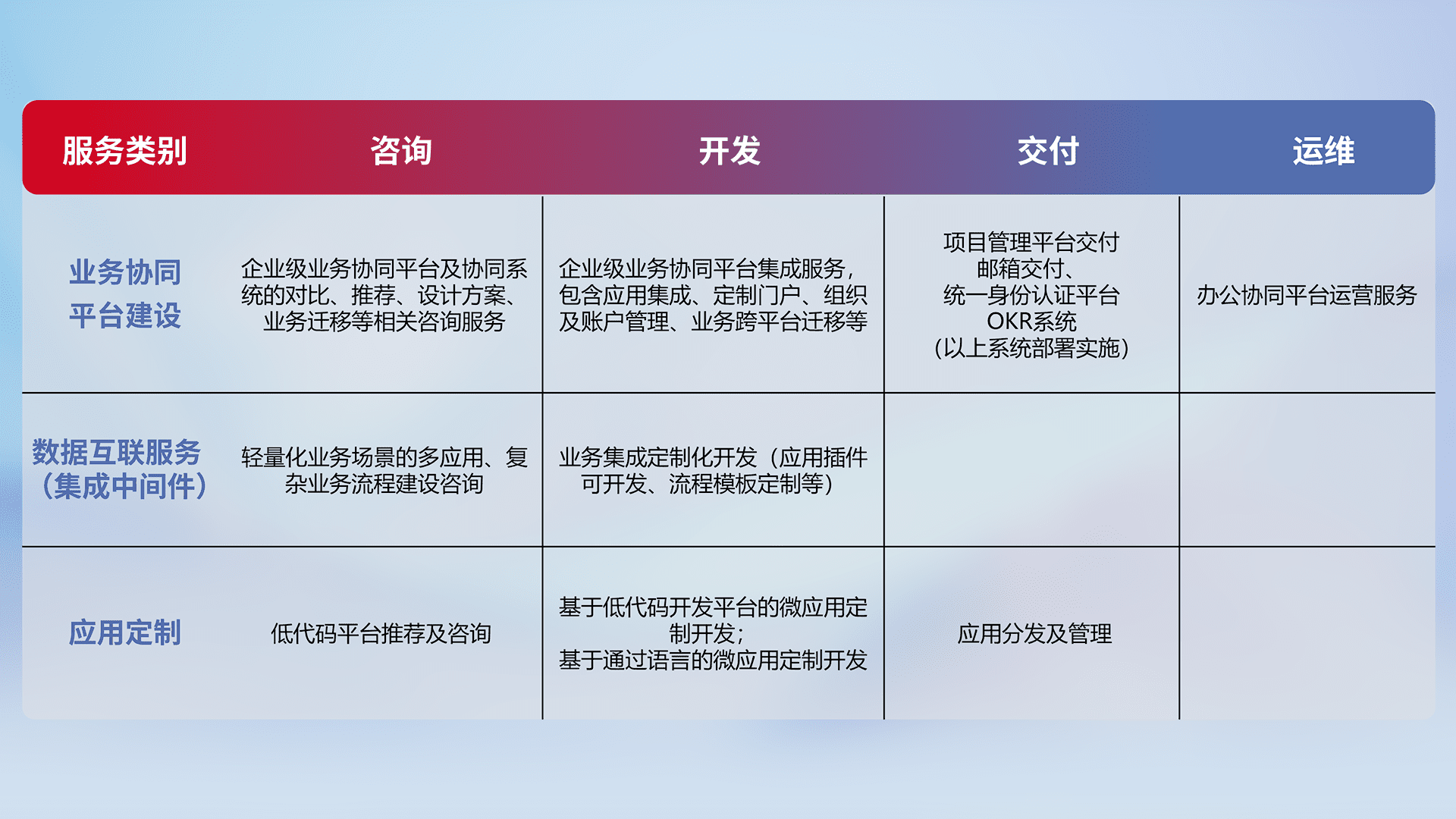 针对钉钉、、、、企微、、IDaas等平台级产品提供产品的规划、、、方案、、交付、、、、定制化开发等服务,,,,实现如统一协同办公、、、、智能客户服务、、、混合会议管理、、、、智能数据查询、、等业务场景,,,实现数字化转型。。