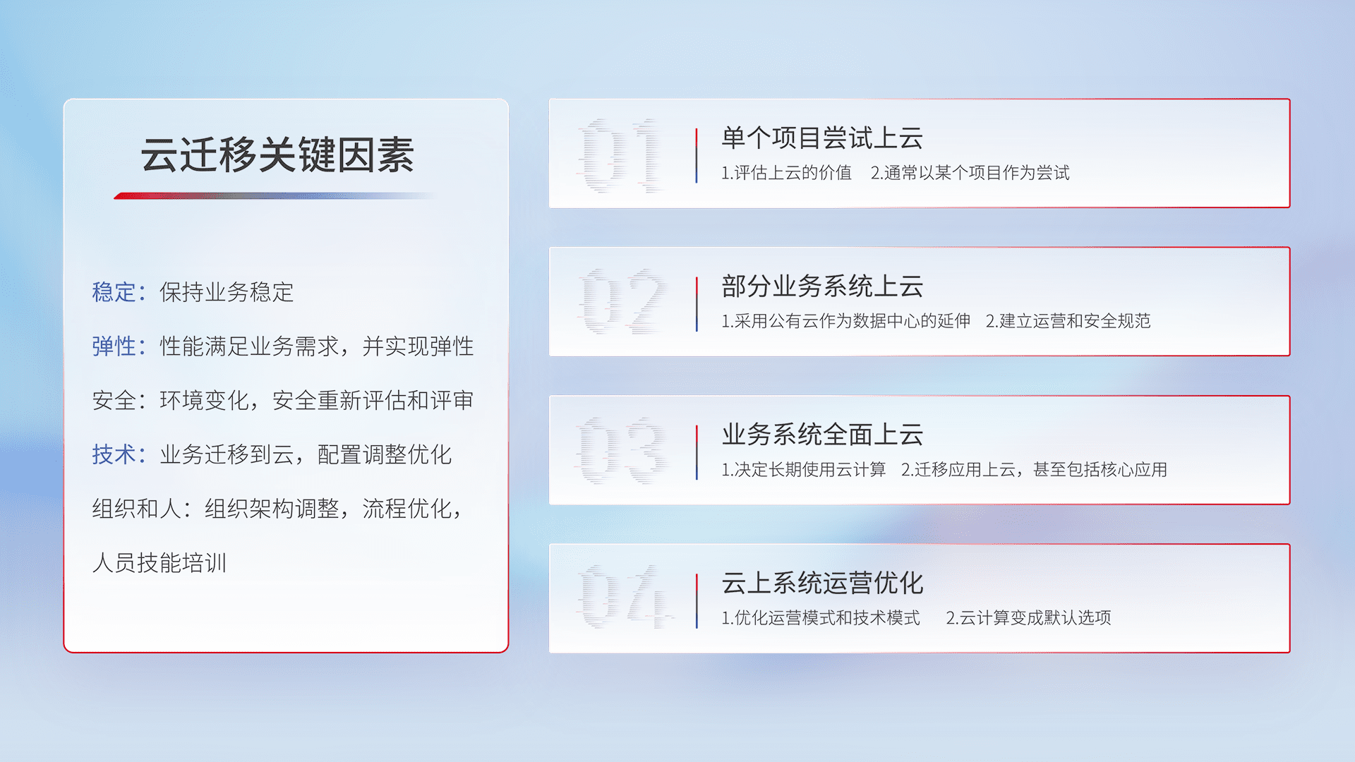 结合实际业务,,,,从规划设计、、云平台选型、、、、云原生改造、、数据迁移、、集成交付,,迁移全过程为客户识别最佳上云路径,,做好风险识别管理,,,,设计网络架构、、、、身份权限、、安全审计合规、、操作审计、、、日志审计、、监控告警策略、、、多站点容灾设计等,,,对云上基础设施进行整体规划,,,,提升IT治理水平,,,,以满足弹性、、、高可用、、高性能的需求。。。。