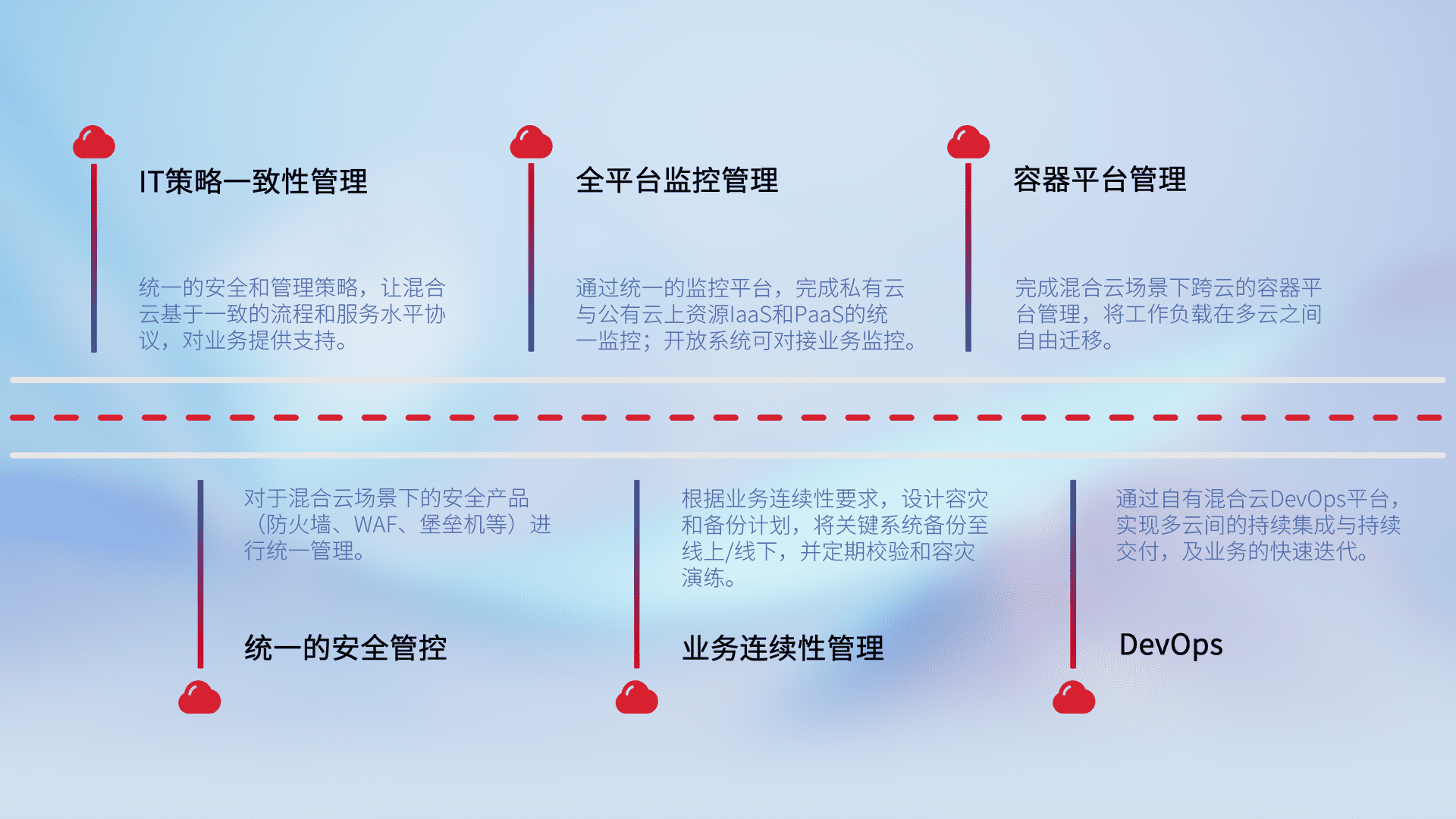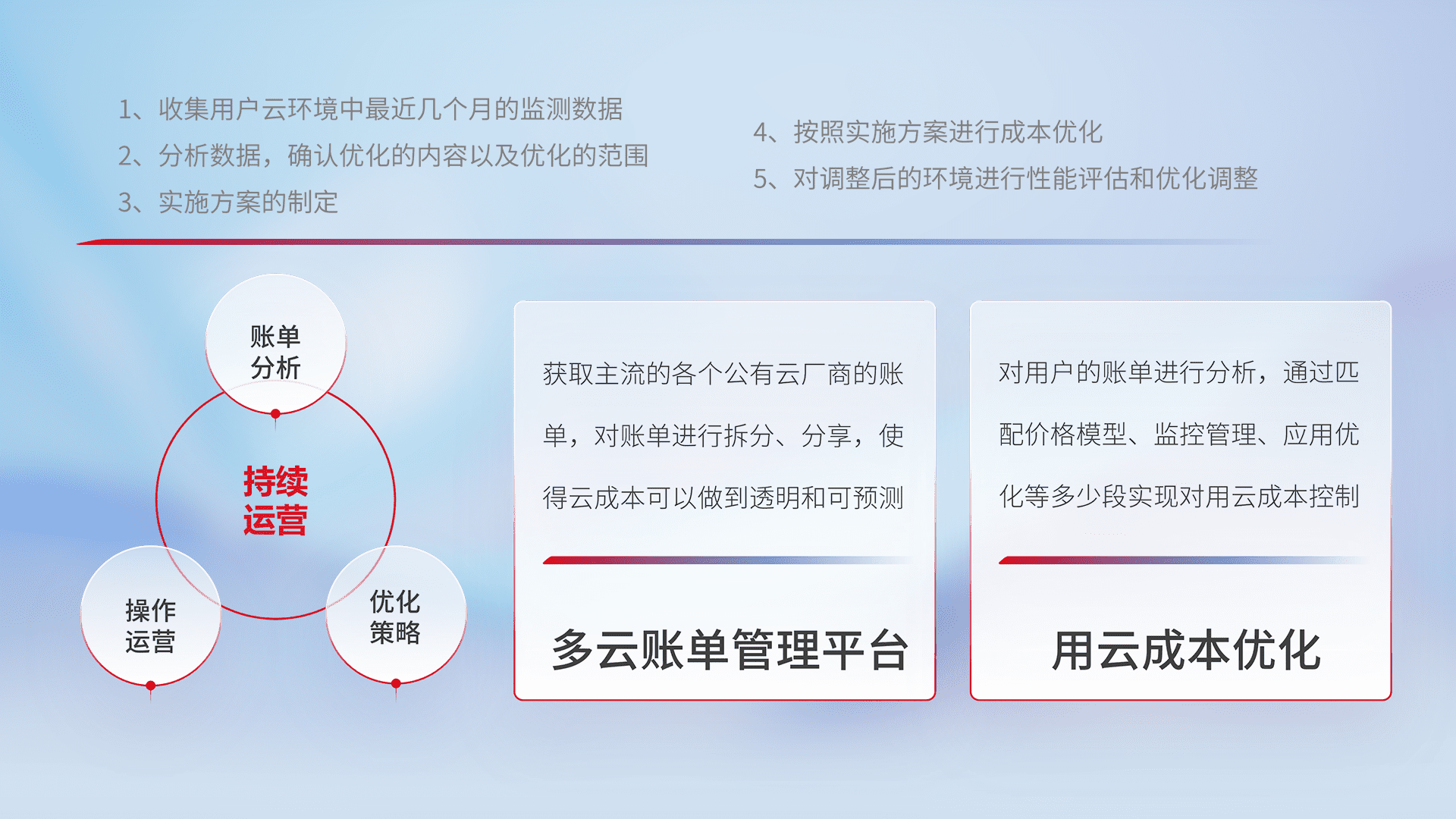 通过多云纳管,,,以统一的资源数据模型把客户的云资源进行抽象和封装,,,进而实现对多云资源的统一操作,,保障云资源管理的可靠性、、稳定性与可用性。。量身定制化运维内容,,,,配置、、、、开发运维、、、补丁管理、、、备份、、、、监控、、、、认证和访问管理、、、审计和日常巡检等,,,保障在用云过程中的可靠度,,,,稳定度以及高可用率。。。。