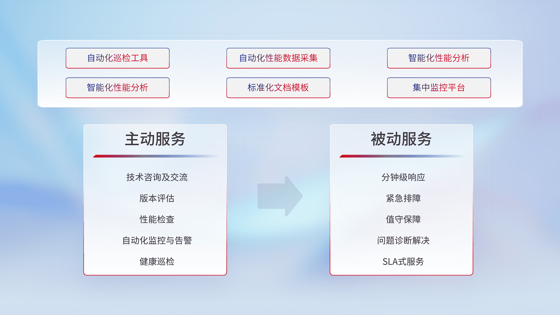 智能化工具和标准化文档,,保障服务质量,,,提供主动服务(包含技术咨询、、、、版本评估、、、、性能检查、、、、自动化监控与告警、、健康巡检)和被动服务包含(分钟级响应、、、、紧急排障、、值守保障、、、问题诊断解决、、SLA服务)。。