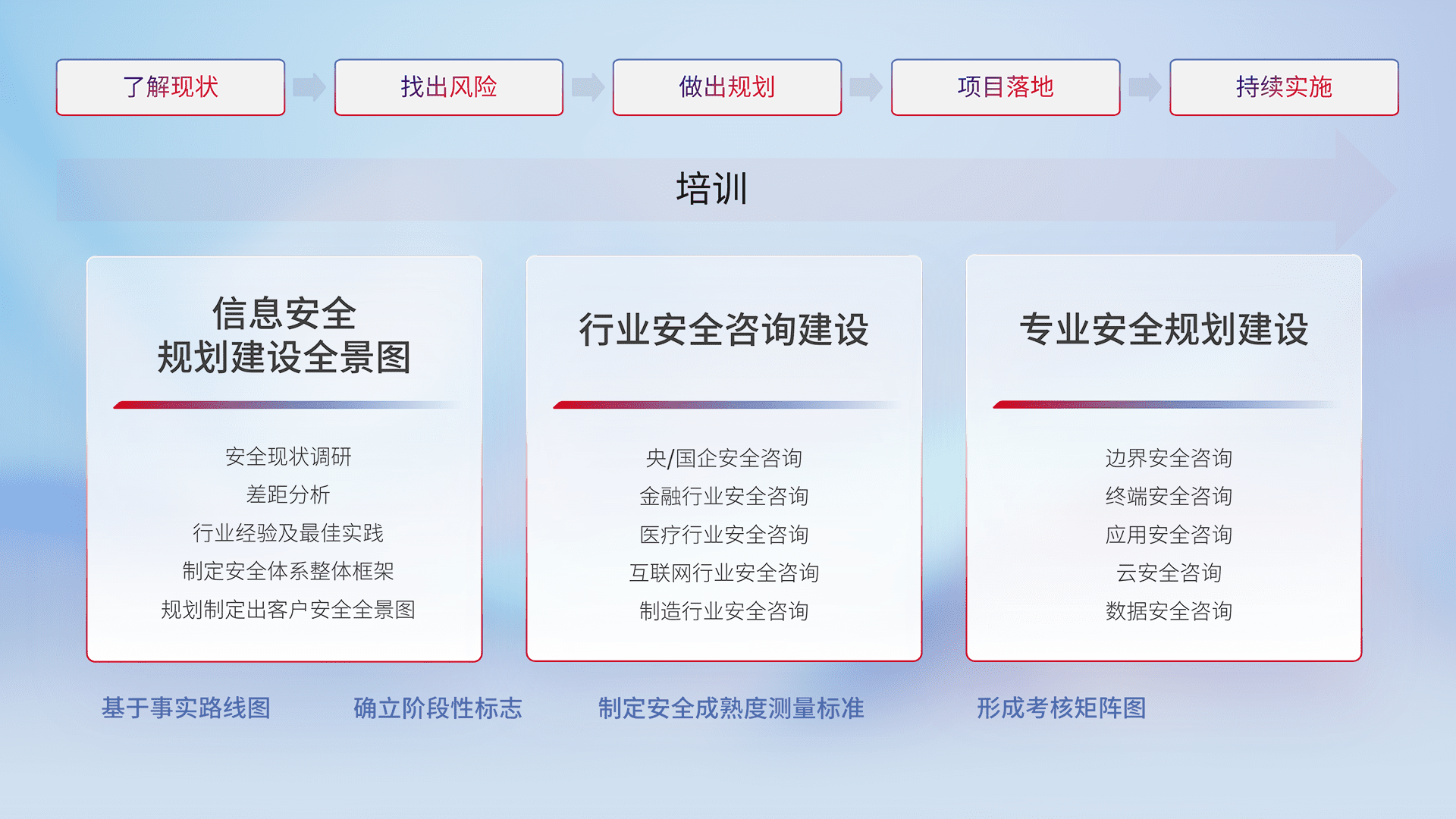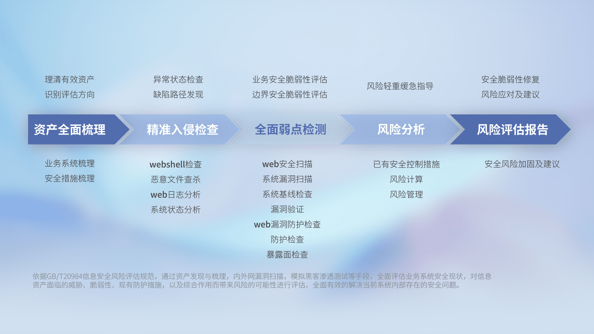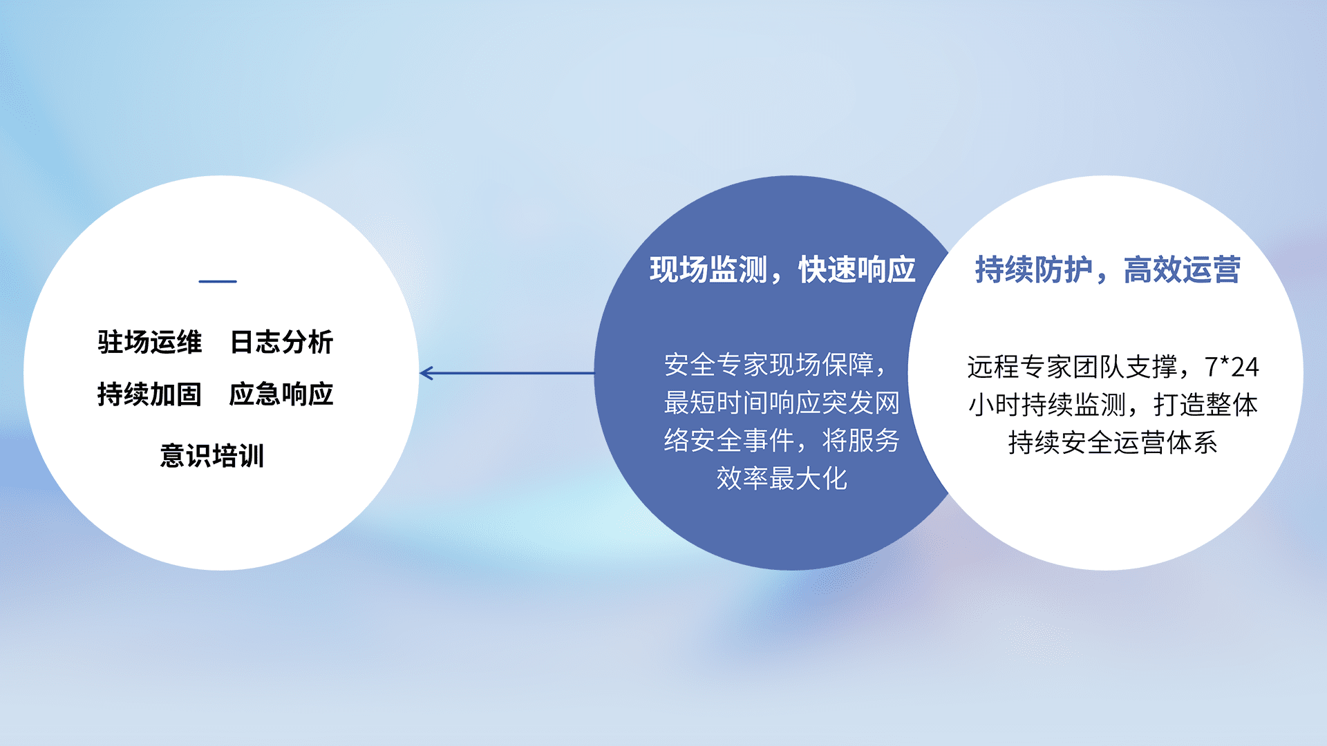 针对客户行业特性,,,,以专业的安全服务+多厂商联合解决方案提供专属的一站式安全管理服务,,,帮助客户全面感知网络空间威胁,,基于识别、、、、检测、、分析、、、防护、、监测、、、、响应的服务理论模型,,,从方案咨询、、、、集成交付、、、、评估验证、、优化加固、、、、运维运营,,,,致力于为客户提供完整的闭环管理式安全服务。。。以实战经验为客户打造高抵御风险的安全体系,,,帮助客户发现威胁、、、、对抗威胁、、、、处置威胁,,,,不断积累安全对抗能力,,持续保障数字化安全。。